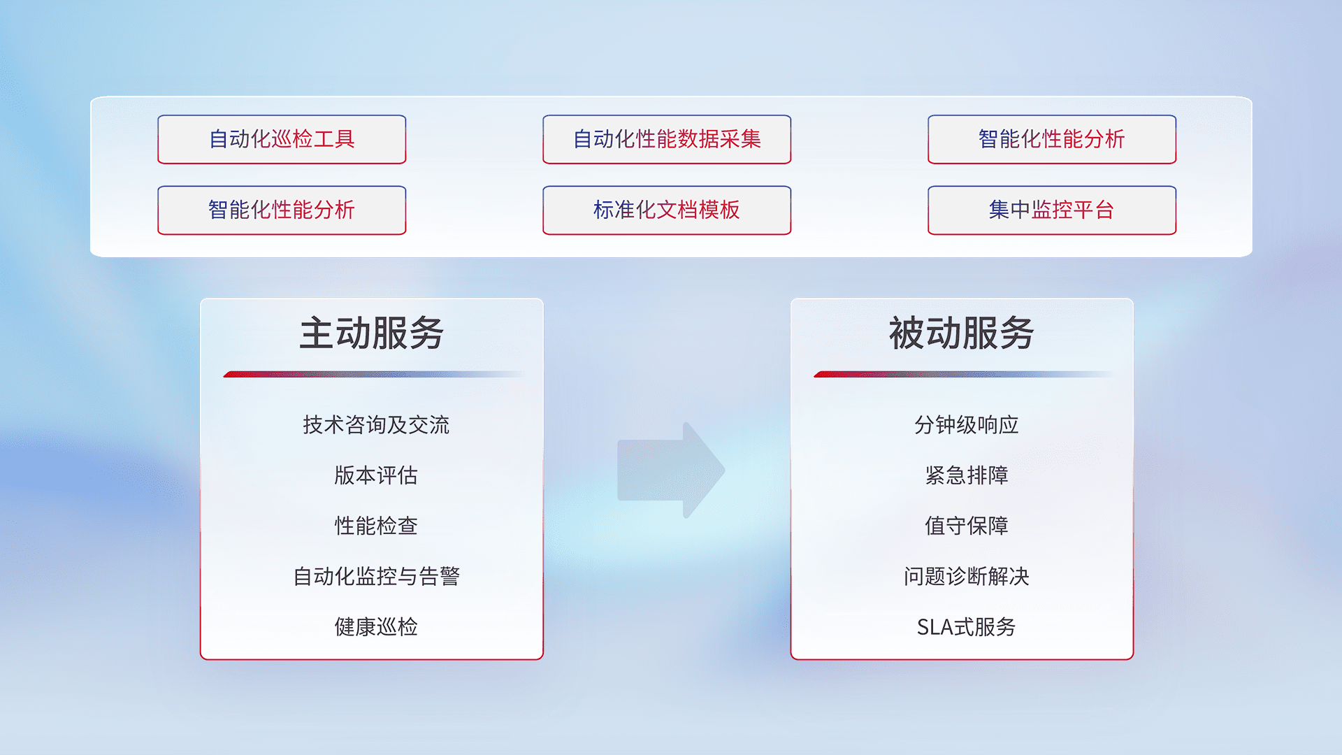 智能化工具和标准化文档,,,保障服务质量,,,提供主动服务(包含技术咨询、、、版本评估、、、、性能检查、、、自动化监控与告警、、、健康巡检)和被动服务包含(分钟级响应、、、、紧急排障、、、值守保障、、、、问题诊断解决、、、、SLA服务)。。。